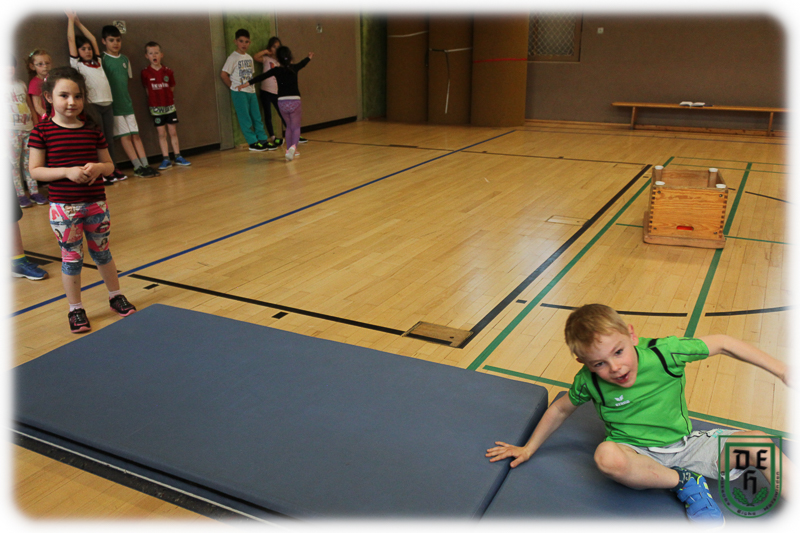 Durch klassisches Turnen, wie Reck, Boden und Balken lernen die Kinder wichtige konditionelle und koordinative Fähigkeiten wie Beweglichkeit, Gleichgewicht und Orientierung. Es werden aber auch leichtathletische Elemente, wie Laufen, Werfen, Springen für Kraft und Ausdauer mit in die Stunde eingebaut. Ein nicht unwesentlich Teil der Stunde besteht aus Bewegungslandschaften und Spielen in Form von freien Spielphasen oder Gemeinschaftsspielen wie das beliebte Zombiball.